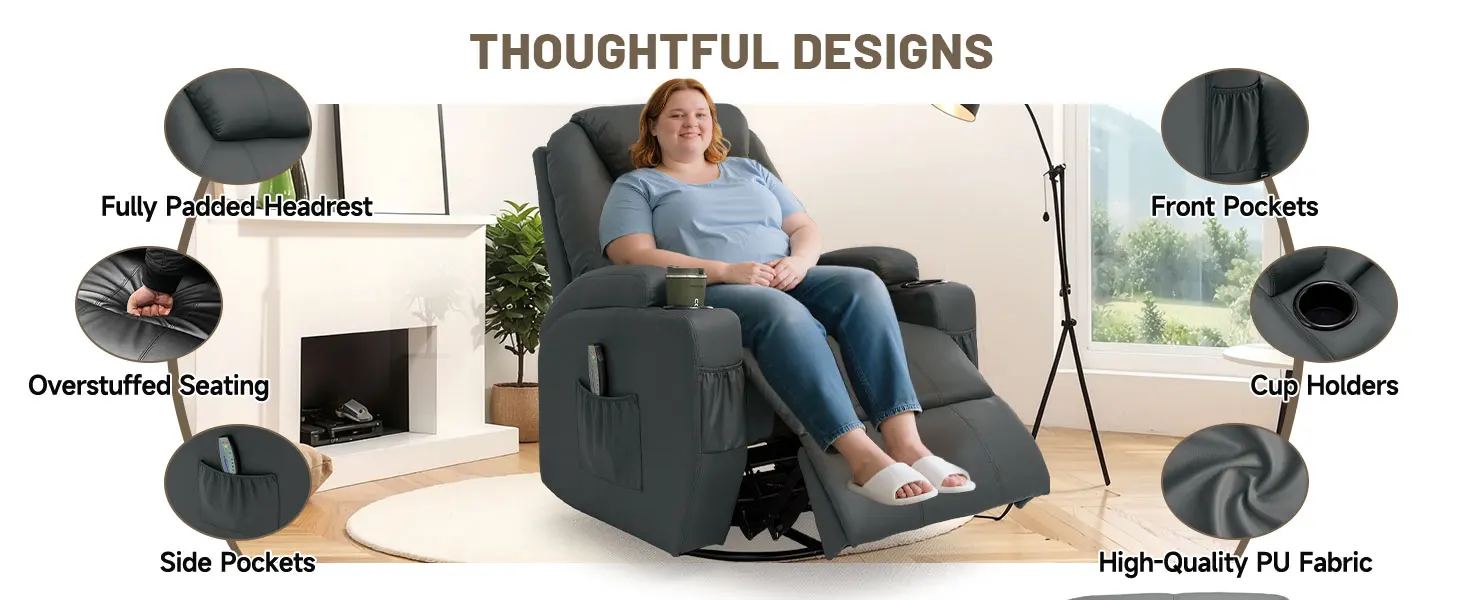 Ample Storage: The recliner chair is designed for your convenience. Featuring four side pockets and dual cup holders, which can provide ample storage for your essentials, making it perfect for relaxing with a book, watching a movie, or enjoying a drink. Recliner cup holders are strategically placed for easy access to your beverages. The cleverly designed storage solutions enhance usability, ensuring everything remains neatly arranged and accessible as you indulge in your moments of relaxation.