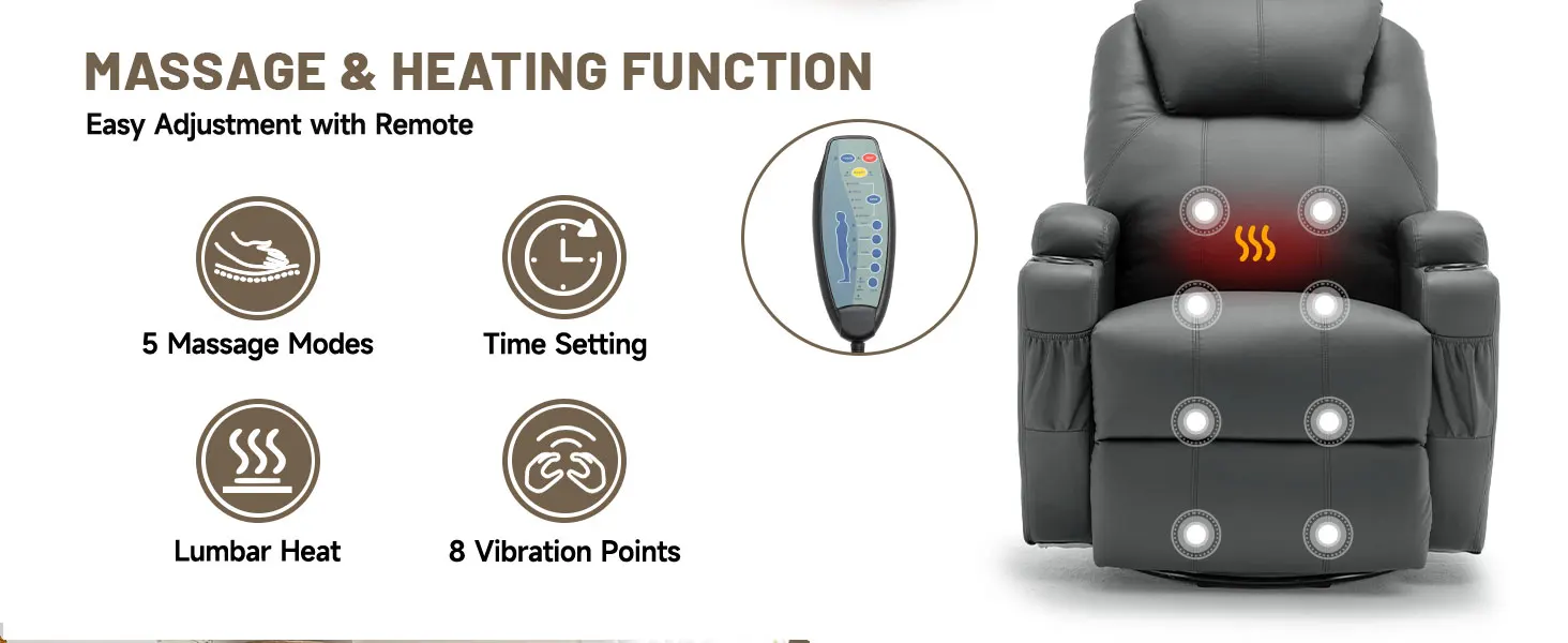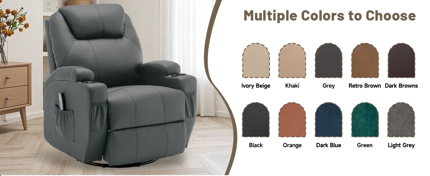 Superior Material: The Swivel Rocker Recliner is designed with comfort and quality in mind. Made from premium faux leather, which is durable, easy to clean, and water-resistant, the recliner chairs for adult cushions are thick padded with high-density sponges that offer excellent support while sitting. The high-resilience sponges ensure the reclining chair remains comfortable over time, conforming to your body and providing a cozy seating experience.